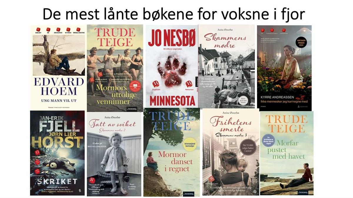 De mest utlånte bøkene fra Hustadvika bibliotek for voksne i 2025 er klar. Topp 10 består kun av romaner og preges av fortellinger fra vår nære historie: Trude Teiges trilogi fra 2. verdenskrig og Anita Østerbøs bøker fra etterkrigstiden. Men Edvard Hoem, Jo Nesbø og Jørn Lier Horst er også, ikke uventet, på lista: